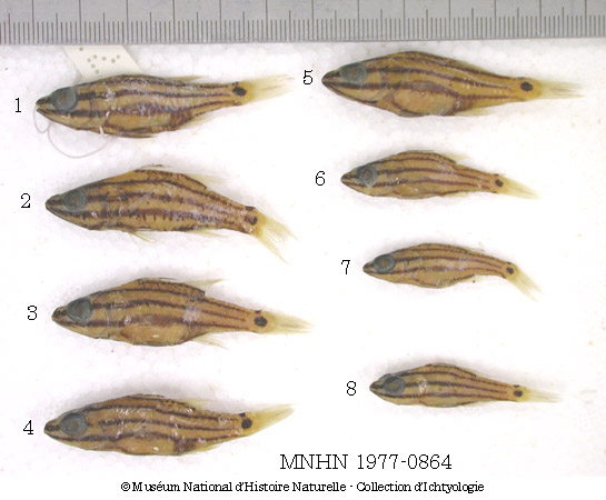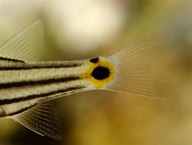 Color in life silvery gray with 4 black stripes. 5th stripe runs along anal-fin base, continues anteriorly to pelvic-fin base, at which point it curves upward to reach in front of pectoral-fin base. The part of this stripe anterior to anal-fin base is often indistinct. A black oval spot at middle of caudal peduncle encircled by a yellow area. A distinct black spot on dorsal surface of caudal peduncle. Area between yellow pigment and this spot appears as distinct white mark. Fins pale (Ref 8525).