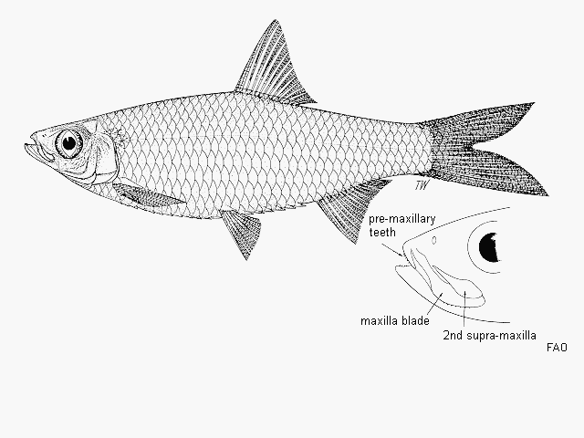 Dorsal spines (total): 0; Dorsal soft rays (total): 12 - 18; Anal spines: 0; Anal soft rays: 16 - 27. Body depth increasing with size of fish, belly sharply keeled, with 9 to 12 + 6 to 9 scutes. Pre-maxillae long and toothed; second supra-maxilla as long as or longer than blade of maxilla. Pectoral axillary scale at least 1/3 length of fin. No grey or silvery stripe along flank (Ref. 188). Last 2 rays of anal fin not forming a separate finlet (Ref. 43281).