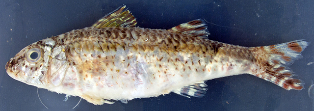 Dorsal spines (total): 8; Dorsal soft rays (total): 9. This species is distinguished by the following characters: D VIII + 9; pectoral-fin rays 13-14; gill rakers 5-6 + 16-17 = 22-23; lateral-line scales 29-30; in %SL: body depth at first dorsal-fin origin 23-26, body depth at anal-fin origin 19-22, caudal-peduncle depth 9.7-9.9, caudal-peduncle width 3.2-3.7, maximum head depth 19-20, head depth through eye 16-17, head length 29-31, postorbital length 11-12, orbit length 6.9-7.3, upper jaw length 10, barbel length 21-22, caudal-peduncle length 21-23, caudal-fin length 29, pelvic-fin length 21, pectoral-fin length 21, pectoral-fin width 4.1-4.7, first dorsal-fin height 19, second dorsal-fin height 17; fins with brown or black stripes, bars or blotches; caudal fin with 8 oblique bars, upper caudal-fin lobe with 3-4 bars, lower lobe with 4-5 bars; first and second dorsal fin tips with dark-brown blotches; one brown mid-lateral body stripe from behind opercle to caudal base; ground colour of body and head beige, darker above lateral line, with irregular red, brown or black spots and blotches; barbels pale brown in fresh fish; preserved fish retain fin and body pigmentation (Ref. 95469).